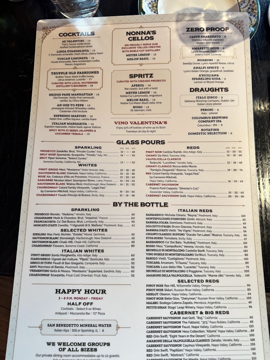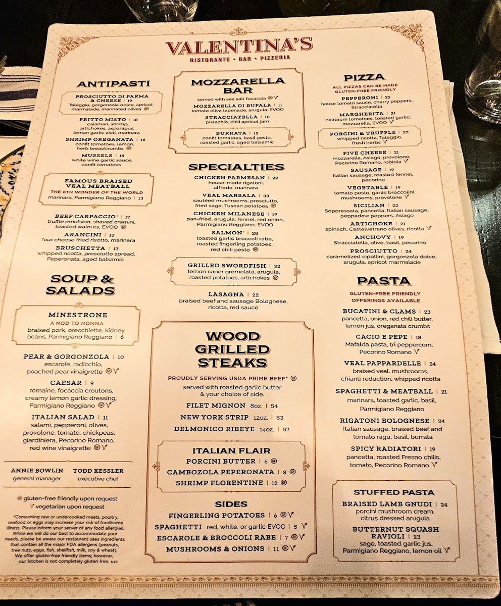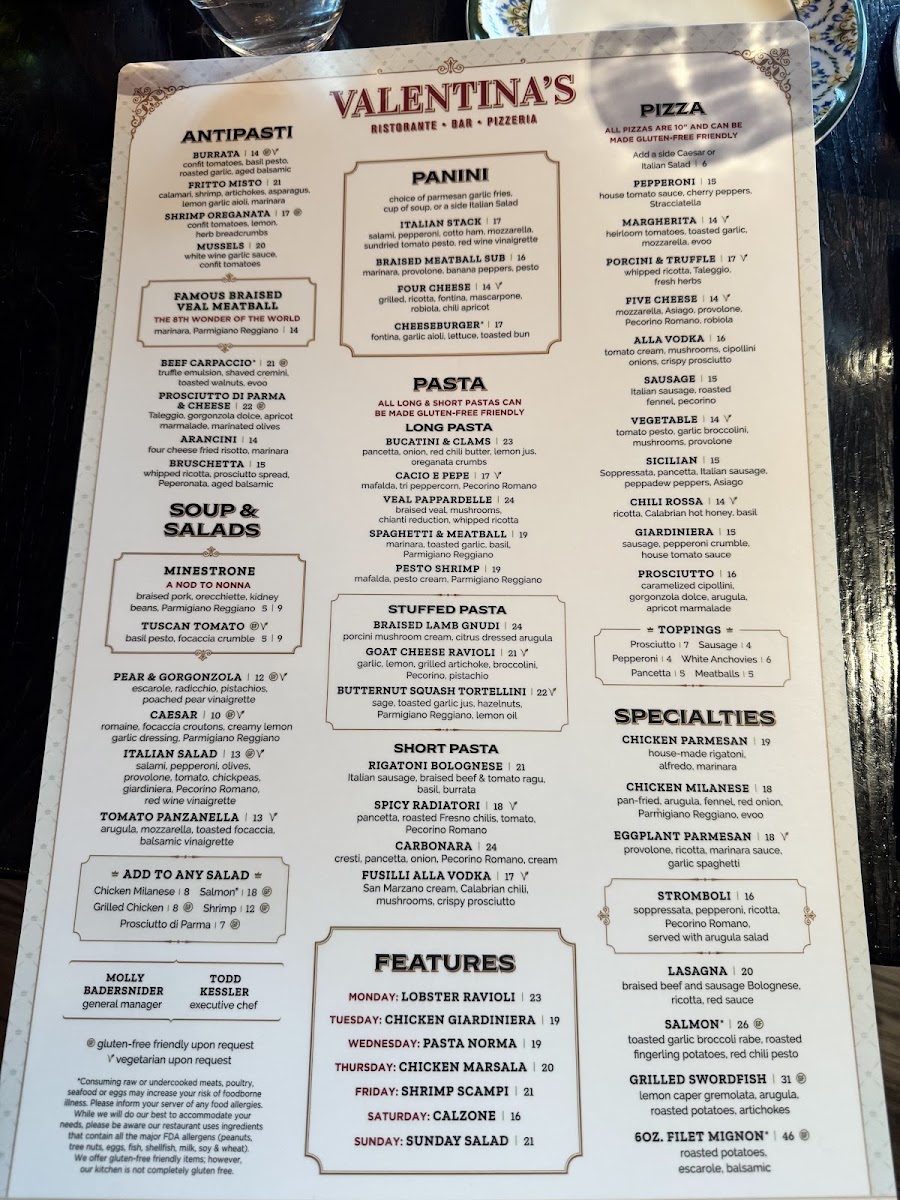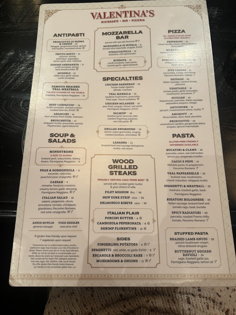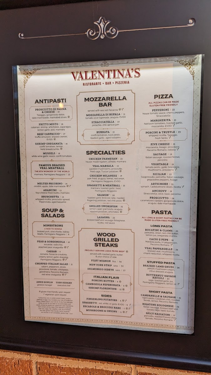 Valentina’s offers a thoughtfully crafted menu featuring classic Italian dishes with a contemporary touch. The selection includes everything from wood-grilled steaks to house-made pastas, making it an appealing choice whether you’re joining for a relaxed lunch, a lively dinner, or a special occasion. The variety ensures there’s something comforting and familiar alongside dishes that invite a moment of indulgence.
